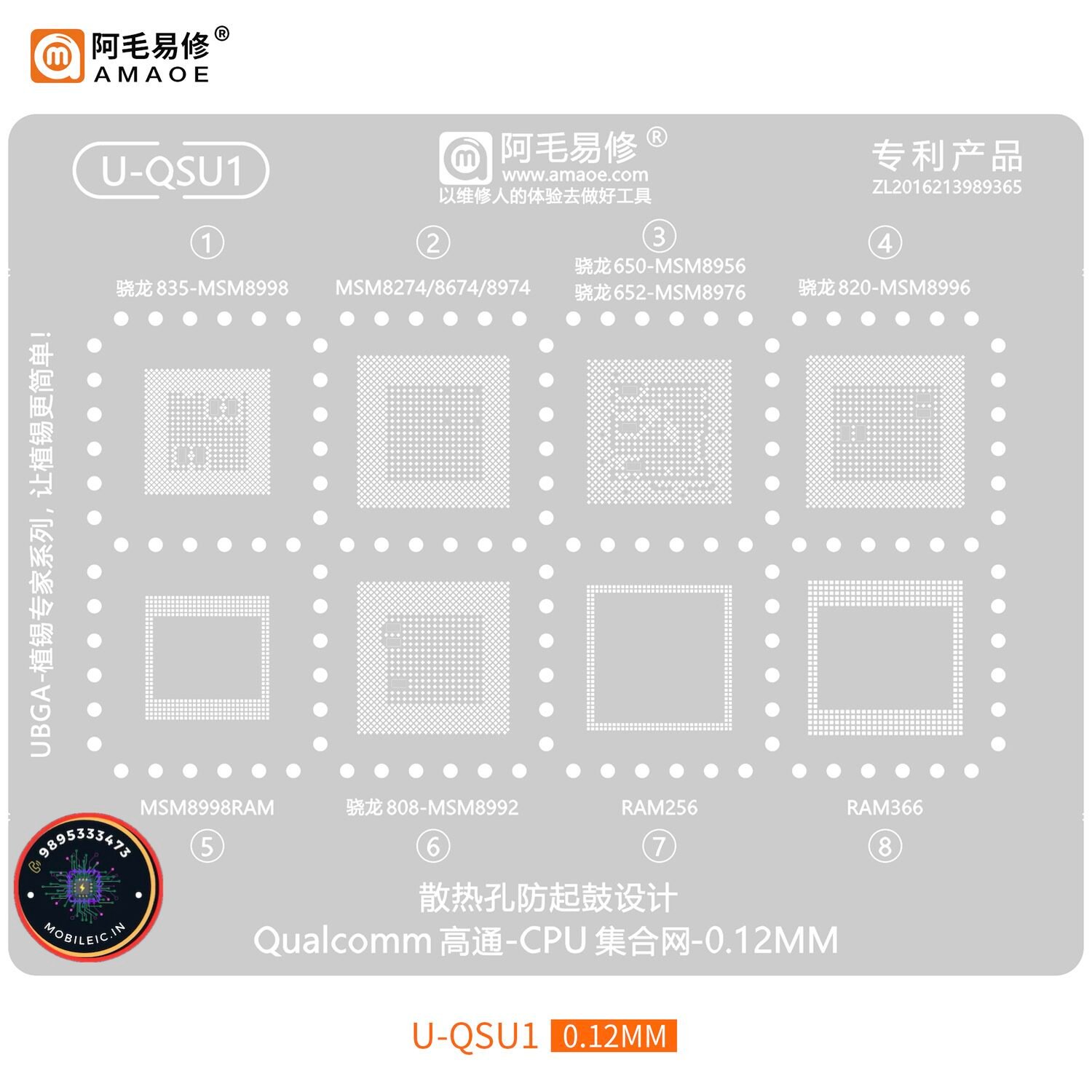 Professional-grade BGA Reballing Stencil designed by AMAOE, the industry leader in mobile repair tooling. This U-QSU1 (Qualcomm Series 1) stencil is engineered for high-precision alignment and durability, specifically tailored for a wide range of Snapdragon processors and dedicated RAM modules.